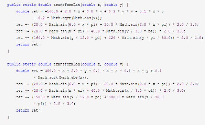 u 代碼轉化:代碼轉化主要對每一個坐標系實現(xiàn)互相轉化,以下就是#FormatImgID_3##FormatImgID_4#GCJ-02轉化成BD-09的代碼實現(xiàn)方法。