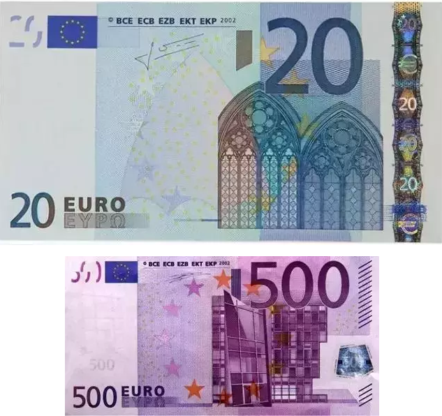 作為世界上防偽技術最先進的歐元,其中也采用了全息標識作為防偽特征之一。5、10、20歐元正面右邊貼有全息薄膜條,變換角度觀察可以看到明亮的歐元符號和面額數字;50、100、200、500歐元正面的右下角貼有全息薄膜塊,變換角度觀察可以看到明亮的主景圖案和面額數字。