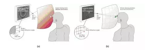 傳統意義上的全息再現如圖(a)所示,可以形成較大的觀察區域,而SEEREAL發現,在這個大的觀察區域中,除了進入瞳孔的兩個視窗之外的區域,其余區域均不能被觀測到,屬于被浪費的信息?;诖?,SEEREAL提出,僅計算對兩眼視窗區域有貢獻的全息圖信息,并藉由眼球追蹤技術追蹤眼球位置,從而使觀看者享受真正的全息立體圖像,如圖(b)。這樣做一方面減少了運算的數據量,另一方面對空間光調制器像素的衍射角要求減少,使得全息圖像的大小不僅僅依賴于像素間距,從而使像素面積得以適當擴大。SEEREAL的這種設計思路很巧妙地克服了目前空間調制器分辨率和數據處理能力對全息顯示發展的制約。