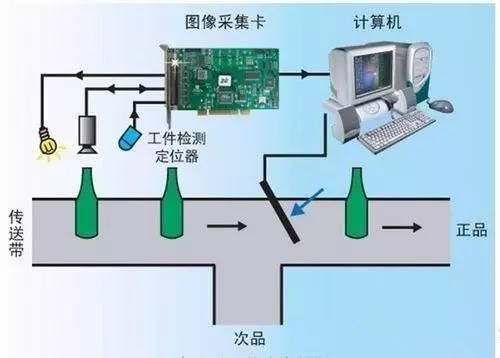 機器視覺系統(tǒng)的特點是提高生產(chǎn)的柔性和自動化程度。在一些不適合于人工作業(yè)的危險工作環(huán)境或人工視覺難以滿足要求的場合,常用機器視覺來替代人工視覺;同時在大批量工業(yè)生產(chǎn)過程中,用人工視覺檢查產(chǎn)品質(zhì)量效率低且精度不高,用機器視覺檢測方法可以大大提高生產(chǎn)效率和生產(chǎn)的自動化程度。而且機器視覺易于實現(xiàn)信息集成,是實現(xiàn)計算機集成制造的基礎(chǔ)技術(shù)。上圖便是機器視覺的一個典型應(yīng)用。