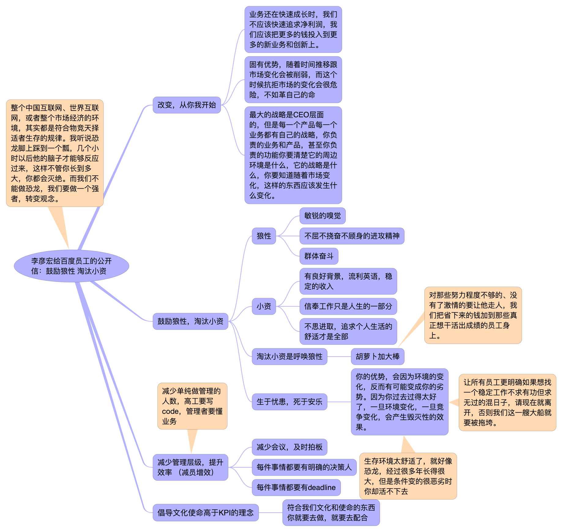李彥宏的公開信題為“改變,從你我開始”,他認為狼性的定義是敏銳的嗅覺、不屈不撓奮不顧身的進攻精神、群體奮斗,與現在的百度非常合適。