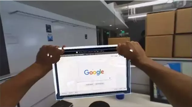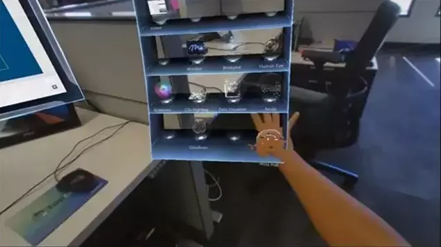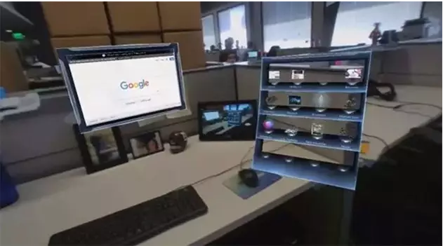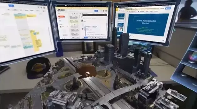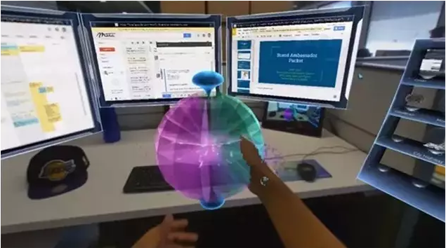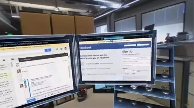 試想一下,整個(gè)辦公室的電腦顯示器都消失了,每個(gè)人都戴著一個(gè)透明面罩的頭戴設(shè)備,外加一個(gè)懶人沙發(fā),躺著用手操作3D模型、瀏覽網(wǎng)頁(yè)、發(fā)送電子郵件,甚至在懸浮的虛擬屏幕上敲代碼...