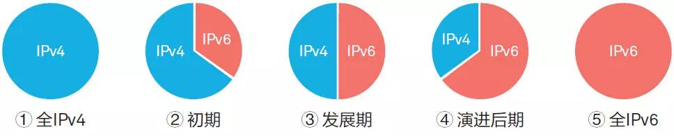 在向IPv6過渡過程中,主要從兩個層面展開,一是對基礎網絡的逐步改造;二是對應用業務進行IPv4向IPv6的遷移。總體來看,主要分如下五個階段展開: