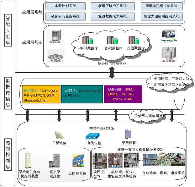 智能節(jié)水灌溉系統(tǒng)采用物聯(lián)網(wǎng)的三層架構(gòu),分為感知控制層、數(shù)據(jù)傳輸層、智能應(yīng)用層,并結(jié)合視頻監(jiān)控系統(tǒng)對農(nóng)作物生長情況的遠(yuǎn)程監(jiān)視,實時對分灌區(qū)環(huán)境參數(shù)的檢測和環(huán)境調(diào)整機(jī)構(gòu)的控制。