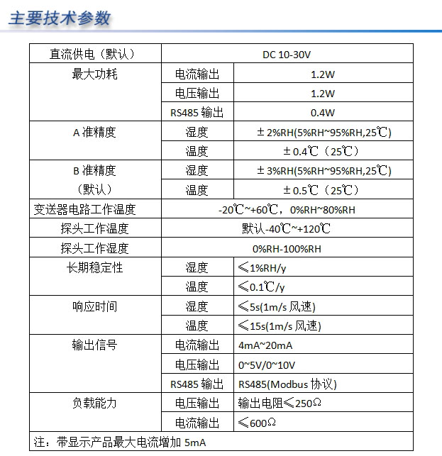 本溫濕度變送器采用外置寬溫溫濕度傳感器,工作量程為-40℃~+120℃范圍內(nèi)任意定制。溫濕度傳感器采用本公司獨(dú)有的防水處理工藝,可實(shí)現(xiàn)溫濕度傳感器長(zhǎng)時(shí)間在熱水中蒸煮而不損壞,充分證明溫濕度傳感器的可靠性。輸出信號(hào)類型分為RS485\4-20mA\0-5V\0-10V等。詳見選型表。