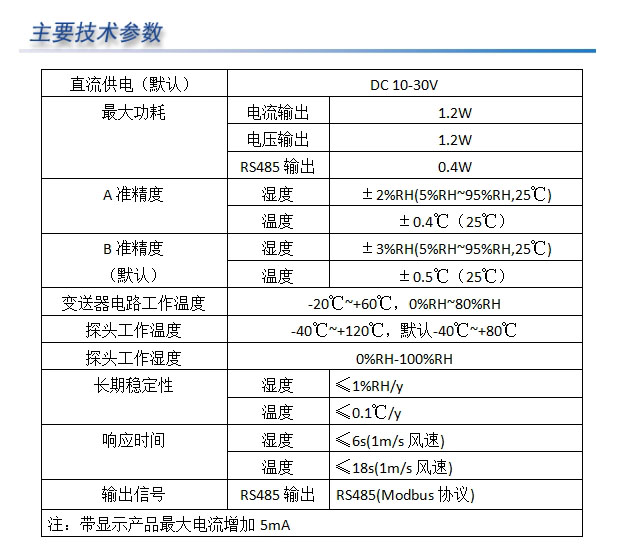 本溫濕度變送器采用銅顆粒燒結(jié)溫濕度傳感器護套,溫濕度傳感器與殼體直接相連外觀美觀大方。輸出信號為RS485輸出。