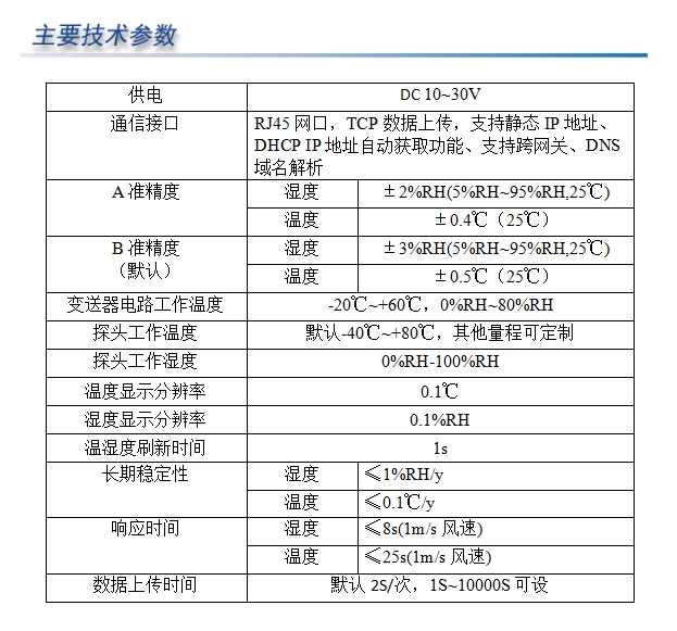 產(chǎn)品是工業(yè)級以太網(wǎng)型溫濕度變送器,可采集溫濕度數(shù)據(jù)并通過以太網(wǎng)方式上傳到服務(wù)器。本系列產(chǎn)品充分利用已架設(shè)好的以太網(wǎng)通訊網(wǎng)絡(luò)實現(xiàn)遠(yuǎn)距離的數(shù)據(jù)采集和傳輸,實現(xiàn)溫濕度數(shù)據(jù)的集中監(jiān)控。可大大減少施工量,提高施工效率和維護(hù)成本。
