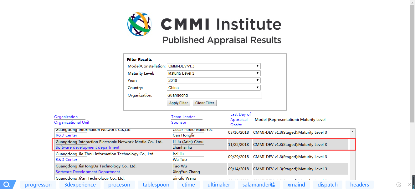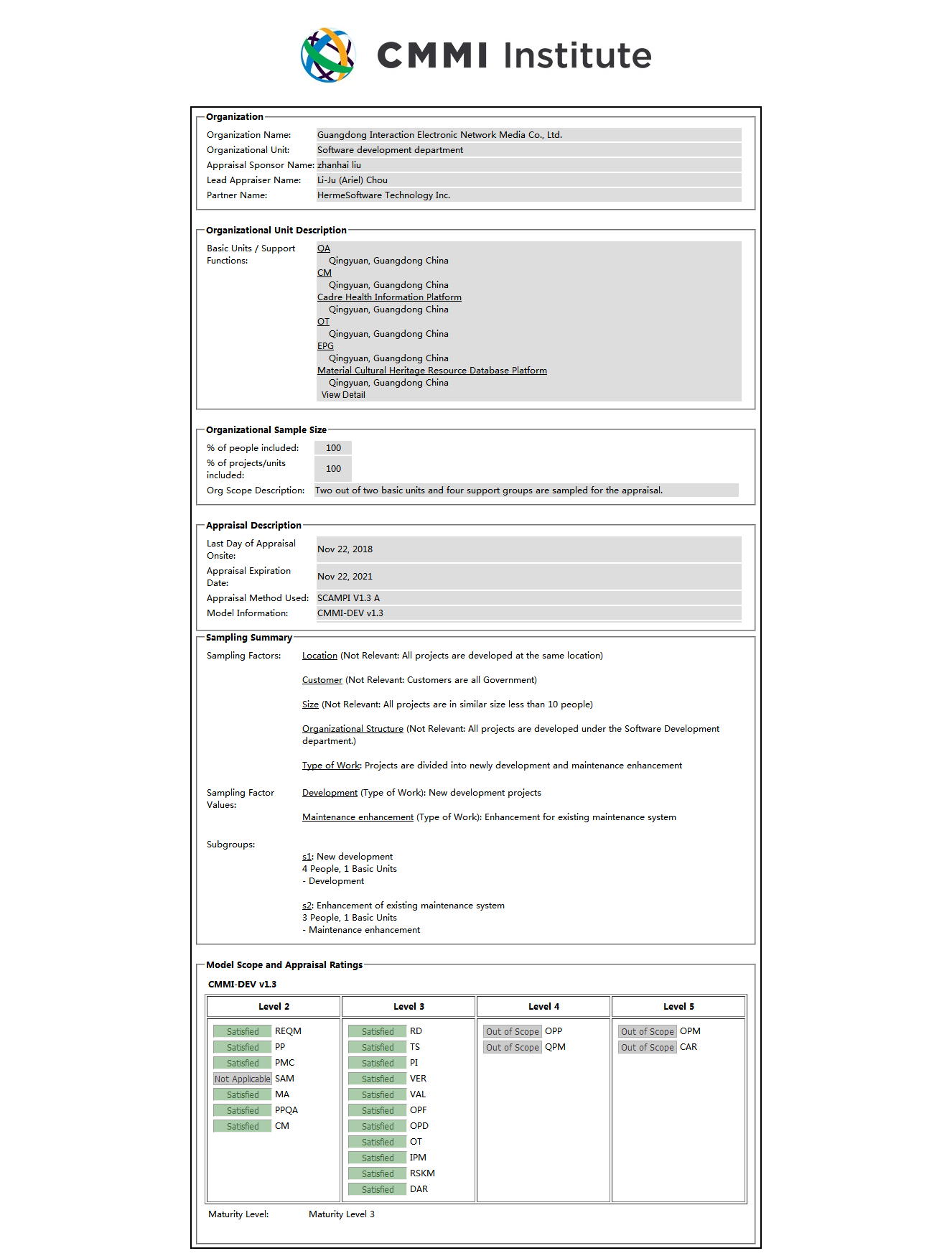 2018年11月23日,經過了為期5天的評估,廣東互動接受了主任評估師周立如的親筆簽名驗收和祝賀,順利通過CMMI L3級認證資格。