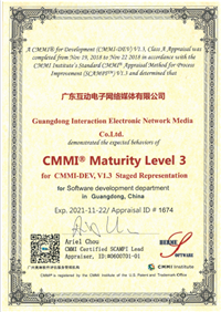2018年11月23日,廣東互動首次取得CMMI L3認證資格。據(jù)悉,CMMI(Capability Maturity Model Integration,即能力成熟度模型集成)是目前國際上最流行的軟件開發(fā)過程標準和軟件企業(yè)成熟度等級認證標準。