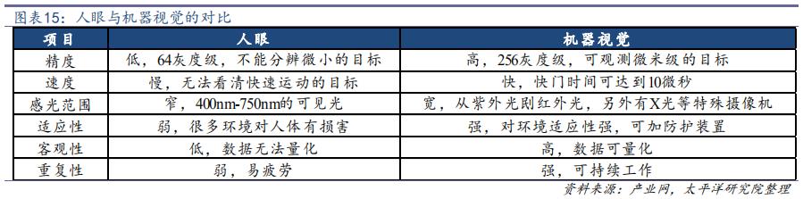 機(jī)器視覺概念在20世紀(jì)50年代提出,20世紀(jì)80年代開始逐步進(jìn)入產(chǎn)業(yè)化,到2000年后進(jìn)入快速發(fā)展期。經(jīng)歷了近20年的高速增長,我們認(rèn)為機(jī)器視覺仍然是一個有較強(qiáng)成長動力的行業(yè),主要驅(qū)動因素來自兩個方面,一是對機(jī)器代人過程的不斷進(jìn)行、二是技術(shù)進(jìn)步使得更多需求得以釋放,前者的底層邏輯主要是人口紅利的消失以及人生理能力的局限性,后者的底層邏輯主要是生產(chǎn)過程向更高效、更精確、更優(yōu)質(zhì)的進(jìn)化。且隨著時間推移,上述驅(qū)動因素的作用力不斷增長,使得機(jī)器視覺在智能制造中的地位從“可選”逐步向“必選”邁進(jìn)。