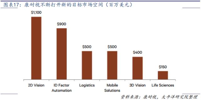 以全球機(jī)器視覺龍頭康耐視為例,基于在條形碼掃描、3D機(jī)器視覺以及AI和深度學(xué)習(xí)等方面的技術(shù)進(jìn)步,其近年來在物流、生物科學(xué)等領(lǐng)域的收入快速增長,2018年康耐視將自己的目標(biāo)市場空間從29億美元上調(diào)到了35.5億美元,且未來還有進(jìn)一步上調(diào)的潛力。