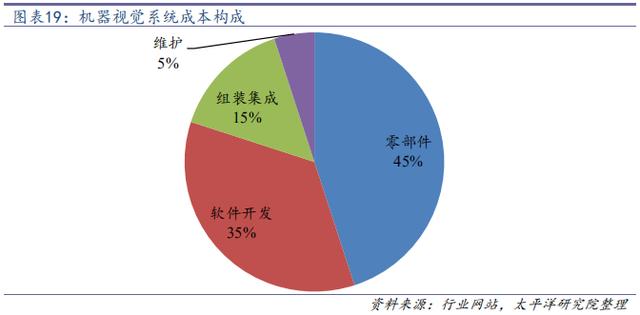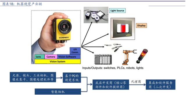 簡單的,我們可以把機(jī)器視覺產(chǎn)業(yè)鏈可以分為底層開發(fā)商(核心零部件和軟件提供商)、集成和軟件服務(wù)商(二次開發(fā)),核心零部件及軟件又可以再細(xì)分為光源、鏡頭、工業(yè)相機(jī)、圖像采集卡、圖像處理軟件等。在目前的整個機(jī)器視覺系統(tǒng)成本構(gòu)成中,零部件及軟件開發(fā)占據(jù)了80%的比例,是產(chǎn)業(yè)鏈中絕對的核心環(huán)節(jié)和價值獲取者。