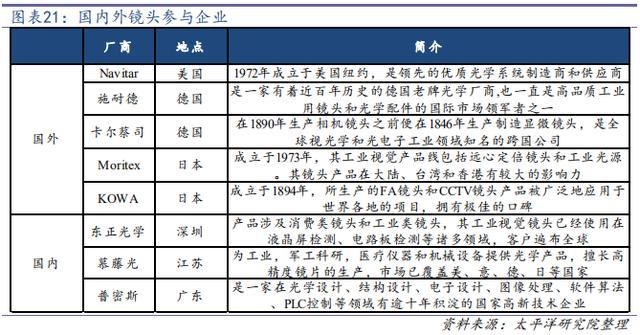 低端鏡頭國內(nèi)企業(yè)具備一定競爭力,高端鏡頭基本依賴進(jìn)口。鏡頭的基本功能是實(shí)現(xiàn)光束調(diào)制,將目標(biāo)成像在圖像傳感器的光敏面上完成信號傳遞。工業(yè)鏡頭主要可以分為定焦鏡頭、定倍鏡頭、遠(yuǎn)心鏡頭、連續(xù)變倍鏡頭等,不同的鏡頭根據(jù)要求應(yīng)用于不同的工業(yè)現(xiàn)場,價格差距也較大。