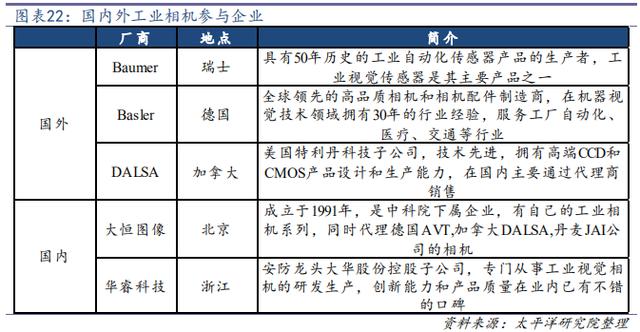 工業(yè)相機(jī)以歐美進(jìn)口為主,國產(chǎn)品牌從低端市場開始逐步進(jìn)口替代。工業(yè)相機(jī)是工業(yè)視覺系統(tǒng)的核心部件,其本質(zhì)功能完成是將光信號轉(zhuǎn)變成電信號的過程,要求更高的傳輸力、抗干擾力以及穩(wěn)定的成像能力。