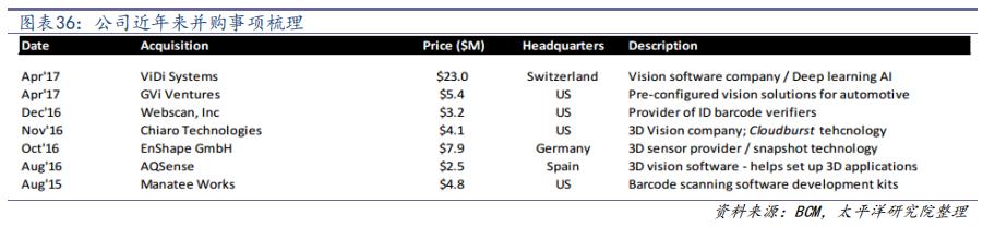 并購也是康耐視不斷做大并成為全球性公司的重要手段。公司的并購主要在四個方向:1)擴(kuò)大產(chǎn)品線;2)獲取最先進(jìn)的技術(shù);3)擴(kuò)大客戶群或進(jìn)入新領(lǐng)域;4)拓展經(jīng)銷商網(wǎng)絡(luò)。2016-2017 年,公司一共完成了 6 項(xiàng)小的并購,金額在幾百萬到幾千萬美元不等。