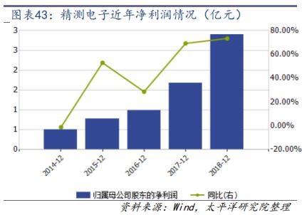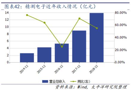 精測電子是一家從事 TFT-LCD(液晶顯示器)\PDP(等離子體顯示器)\OLED 平面顯示信號測試技術(shù)的研究、開發(fā)、生產(chǎn)與銷售為一體的高新技術(shù)企業(yè),也是目前國內(nèi)平面顯示信號測試領(lǐng)域的龍頭企業(yè),產(chǎn)品已在京東方、三星、LG、夏普、松下、中電熊貓、富士康、友達(dá)光電等知名企業(yè)批量應(yīng)用。精測電子 2018 年實(shí)現(xiàn)營業(yè)收入 13.9 億元,同比增長 55.24%,其中 AOI 檢測設(shè)備 5.5 億元,占比接近 40%,OLED 檢測系統(tǒng) 2.3 億元,占比 16.48%,平板顯示自動化設(shè)備 2.65 億元,占比 19.07%,模組檢測系統(tǒng) 2.98億元,占比 21%;2018 年精測電子實(shí)現(xiàn)歸母凈利潤 2.89 億元,同比增長 73.19%。