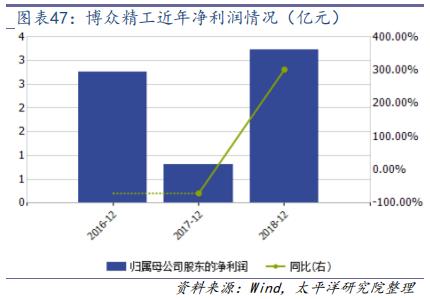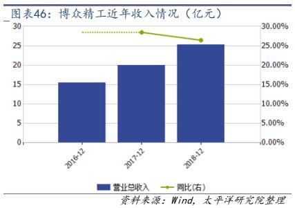 博眾精工公司主要從事自動化設(shè)備、自動化柔性生產(chǎn)線、自動化關(guān)鍵零部件以及工裝夾(治)具等產(chǎn)品的研發(fā)、設(shè)計(jì)、生產(chǎn)、銷售及技術(shù)服務(wù),同時,公司亦可為客戶提供智能工廠的整體解決方案,業(yè)務(wù)涵蓋消費(fèi)電子、新能源、汽車、家電、日化等行業(yè)領(lǐng)域。2018 年博眾精工實(shí)現(xiàn)營業(yè)收入 25.18 億元,同比增長 26.42%,實(shí)現(xiàn)歸母凈利潤 3.2 億元,同比增長 301.8%。