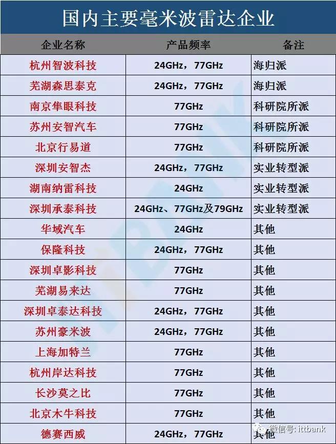 中國第一批做毫米波雷達的創業企業,大多都成立在2014-2016這幾年,團隊往往是科研背景、軍工背景、或供應商跳槽創業背景。比如海歸派:森思泰克、杭州智波。科研院所派:行易道、南京隼眼、蘇州安智、蘇州豪米波。實業轉型派:深圳安智杰、深圳承泰、湖南納雷。還有依萊達、德賽西威、木牛、雷博泰克、深圳卓影等。