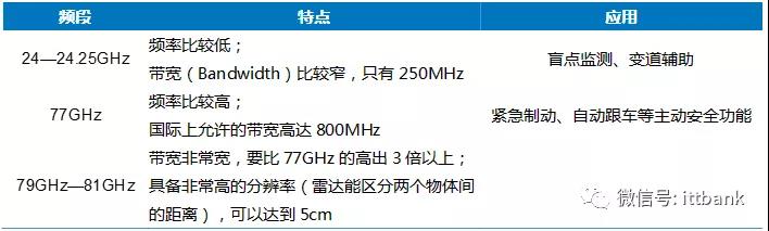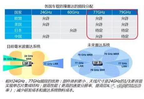 目前各個國家對車載毫米波雷達分配的頻段各有不同,但主要集中在24GHz和77GHz,少數國家(如日本)采用60GHz頻段。由于77G相對于24G的諸多優勢,未來全球車載毫米波雷達的頻段會趨同于77GHz頻段(76-81GHz)。