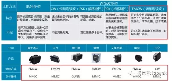 根據輻射電磁波方式不同,毫米波雷達主要有脈沖體制以及連續波體制兩種工作體制。其中連續波又可以分為FSK(頻移鍵控)、PSK(相移鍵控)、CW(恒頻連續波)、FMCW(調頻連續波)等方式。