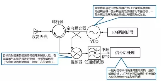 MMIC芯片和天線PCB板是毫米波雷達的硬件核心,以FMCW汽車雷達系統為例,主要包括天線、收發模塊、信號處理模塊。