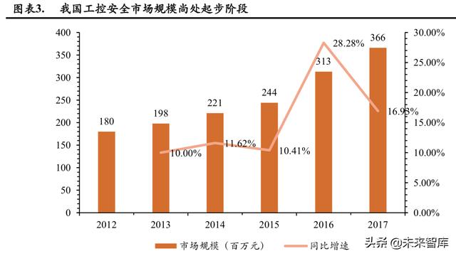我國工控安全行業尚處起步階段,整體規模較小。根據前瞻產業研究院的數據,2017 年我國工控安全市場規模為 3.66 億元,同比增長 16.93%。