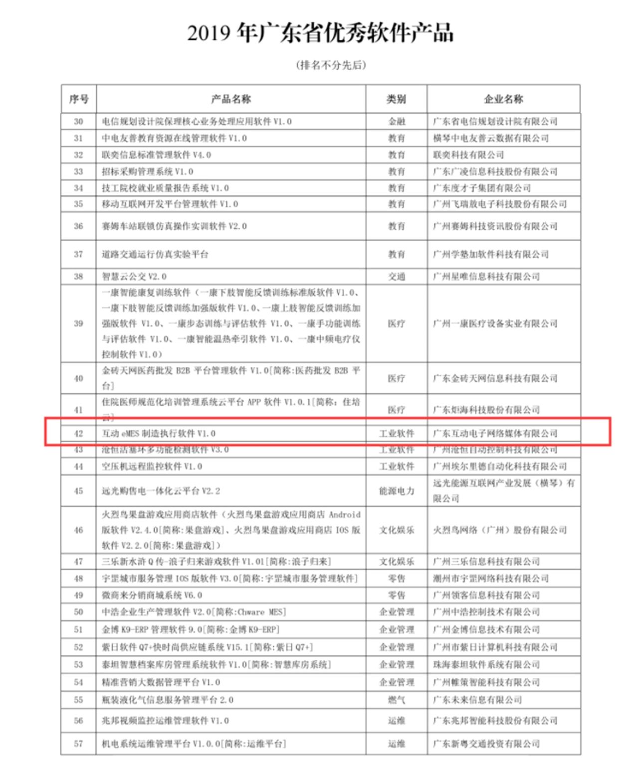 廣東互動電子網絡媒體有限公司研發的“eMES制造執行軟件 V1.0”這款軟件產品經過層層角逐喜獲2019年廣東省優秀軟件產品獎項,此優秀軟件產品獎項我司已是連續3年獲得。