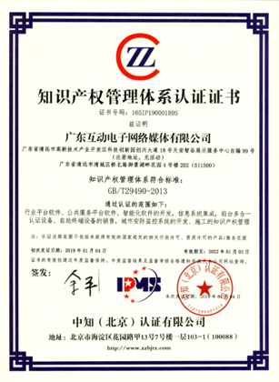 2019年1月4日,廣東互動電子網絡媒體有限公司順利通過了《企業知識產權管理規范(GB/T-29490-2013)》國家體系認證,并獲得由中知(北京)認證有限公司頒發《知識產權管理體系認證證書》,獲得“知識產權管理體系認證證書”標志著對我司在知識產權管理的標準化、規范化方面極大認可,這將是我司發展史上的又一里程碑。