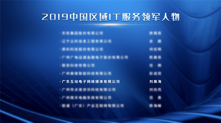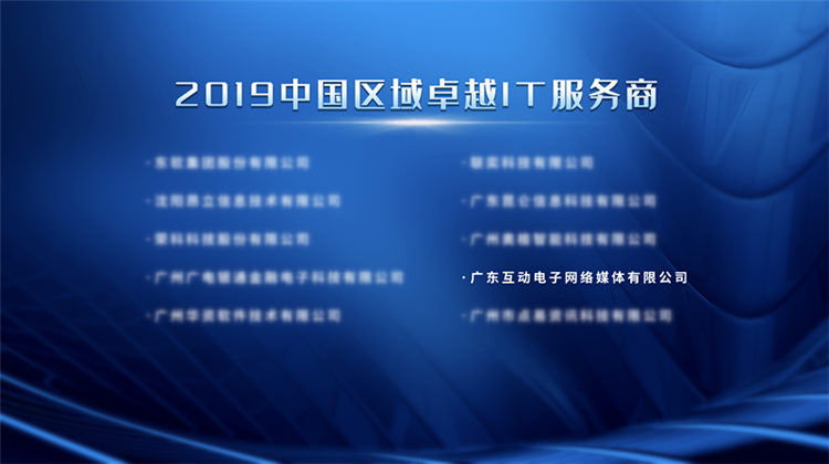 2020年1月9日,第十二屆電子信息產業標準推動會暨中國信息技術服務標準年會在北京召開。大會以“新業態·新模式 新產業”為主題,工信部相關司局領導介紹了工信部標準化總體工作情況以及電子信息、信息化和軟件服務業領域工作重點和技術發展態勢等。廣東互動電子網絡媒體有限公司受邀參會,并榮獲 “2019中國區域卓越IT服務商”;廣東互動總經理劉展海當選“2019中國區域IT服務領軍人物”。